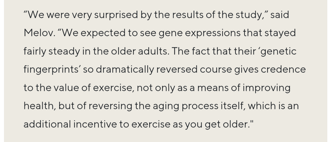 I use the word exercise interchangeably with strength training because the ONLY type of physical activity that can and will reverse aging to this heightened degree is strength training.